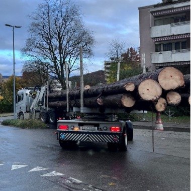 Langholztransporter mit über 22 Meter langen Holzstämmen – ein Fahrzeugtyp, der regelmässig Holztransporte vom