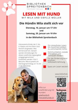 Wenn wir uns an die eigenen Fortschritte beim Lesen erinnern, kann dies sowohl positive wie auch negative Gefühle auslösen und wir alle wissen, dass Lesenlernen ein Kraftakt ist. Und auch hier gilt wie bei vielen anderen Dingen im Leben: Übung macht den/die Meister:in. Einem Tier vorzulesen ist niederschwellig und gerade schüchterne Kinder können sich davon besser angesprochen fühlen als einer anderen Person vorzulesen. Denn ein Hund ist immer neutral und beurteilt nie die Fähigkeiten des ihm vorlesenden Kindes. Mit Sibylle Müller und ihrer dreieinhalbjährigen Golden Retriever Hündin Mila konnte die Gemeindebibliothek ein tolles Team für „Lesen mit Hund“ gewinnen. Damit interessierte Eltern und Kinder Sibylle Müller und Mila kennenlernen können, finden zwei Vorstellungsrunden statt, an denen sich die Hundehalterin und Mila präsentieren und gemeinsam mit der Bibliotheksleiterin Claudia Trefz Fragen beantworten.