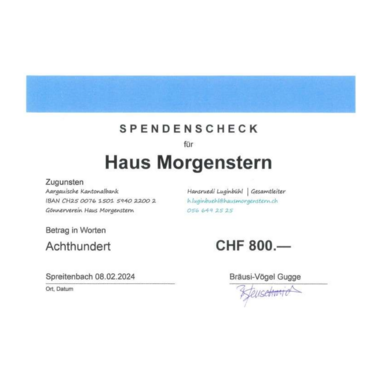 Die Bräusi-Vögel Gugge Spreitenbach möchten damit ihre Verbundenheit mit der Gemeinde und ihr Engagement für wohltätige Zwecke zum Ausdruck bringen. Die Stiftung Haus Morgenstern leistet wertvolle Arbeit im Bereich der sozialen Unterstützung und die Spende soll dazu beitragen, ihre wichtige Arbeit weiterhin zu unterstützen.