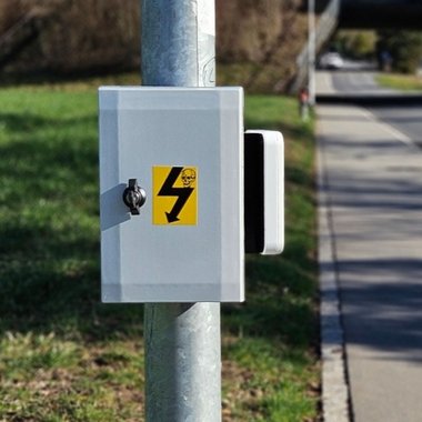 an einem Kandelaber montiert. Keine Sorge – dabei handelt es sich nicht um ein Blitzgerät, sondern um ein Verkehrszählgerät.