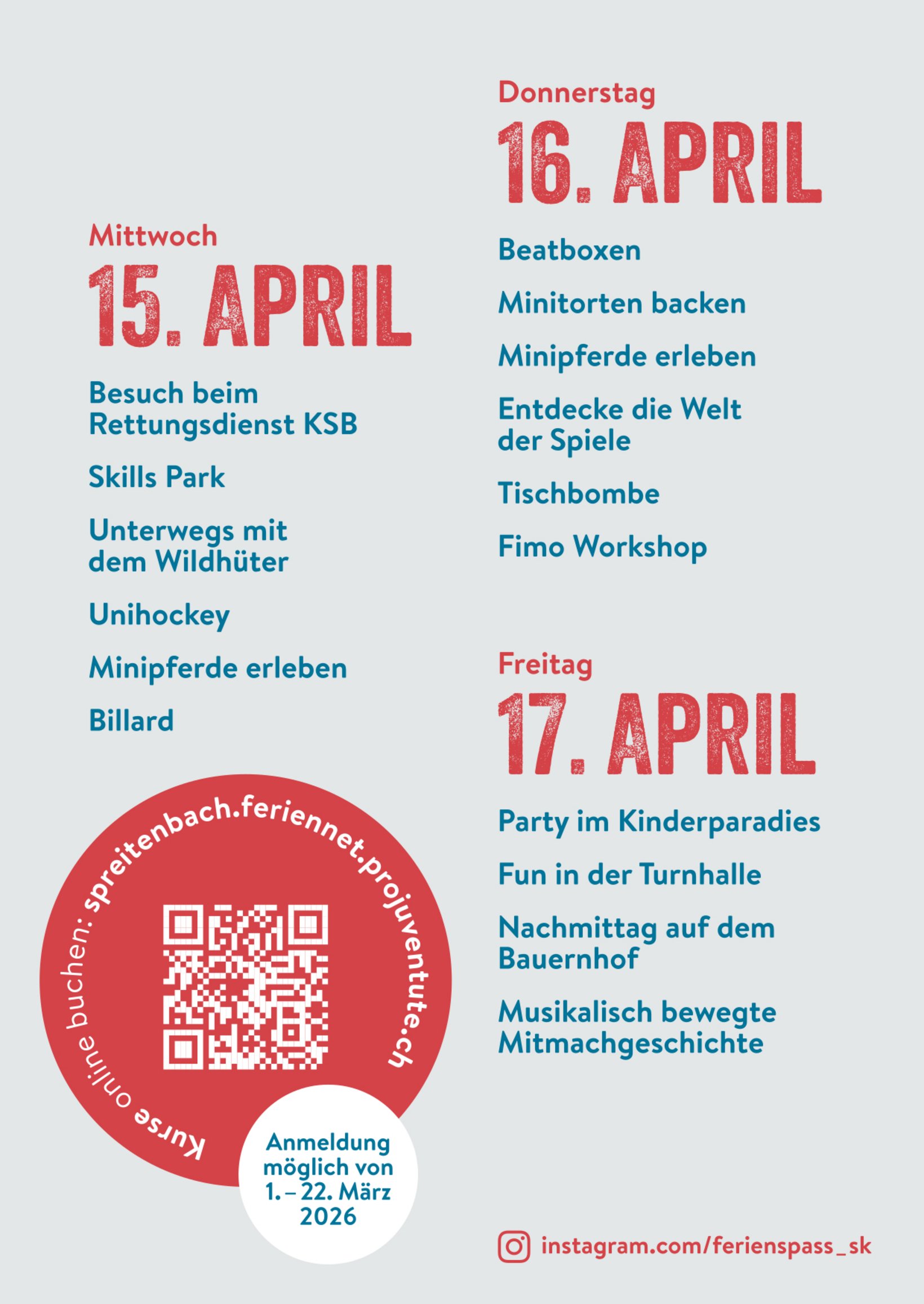 Im Rahmen des FerienSpass 2026 bieten wir zwischen dem 15.04. und 17.04.26 spannende Kurse für Kinder und Jugendliche an. Gebucht werden kann ab dem 01.03.26 auf folgendem Link: spreitenbach.feriennet.projuventute.ch