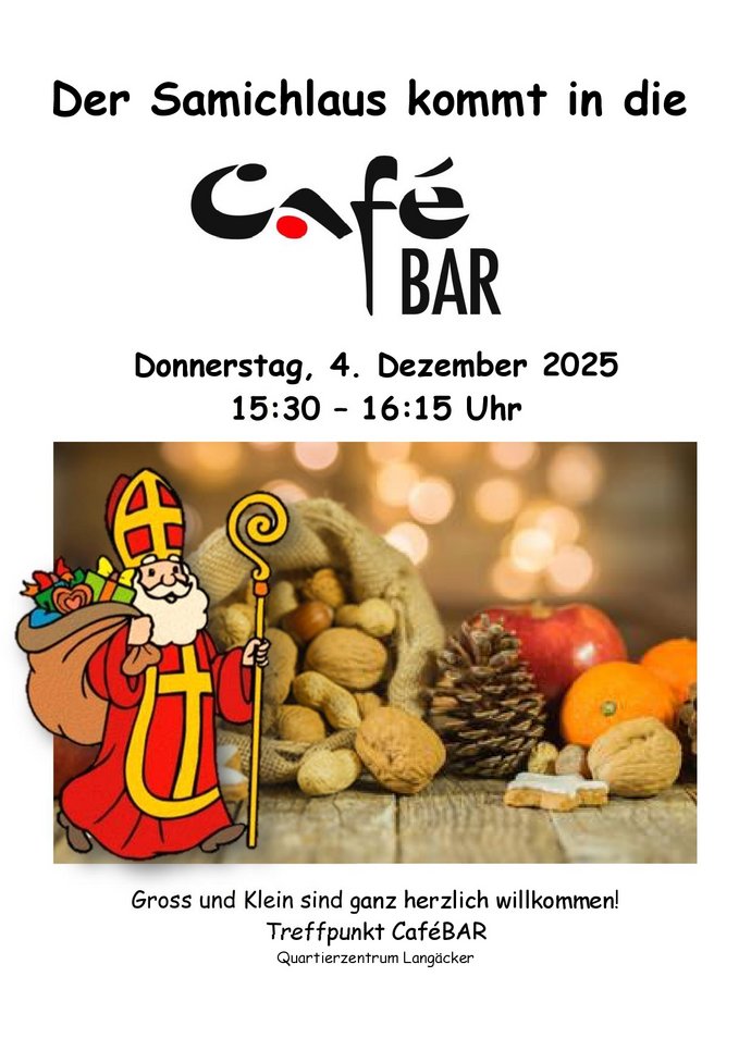 Der Samichlaus besucht den Treffpunkt CaféBAR. Gross und Klein sind ganz herzlich eingeladen.
